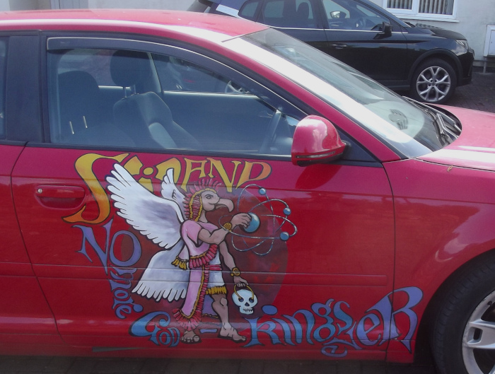 Originally I had been thinking of a large mural such as a STAND death juggler. Maybe when the small (ha ha) modular reactors are half built and the government feels its safe to announce its intentions because its almost too late to complain. Lets face it no one wants to live in a new nuclear industry cluster so I imagine then people will be queueing up for me to paint their gables, cars, coats, whatever.